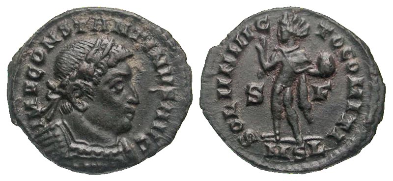 Constantine I. A.D. 307/10-337. AE follis (21.3 mm, 3.51 g, 5 h). London mint, struck A.D. 315. IMP CONSTANTINVS AVG, laureate and cuirassed bust right / SOLI INVICTO COMITI, Sol standing left, extending arm and holding globe; S-F//MSL in exergue. RIC 32. gVF, black patina.