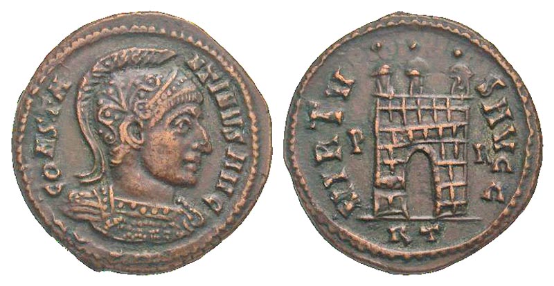 Constantine I. A.D. 307/10-337. AE follis (20.5 mm, 3.79 g, 5 h). Rome mint, struck A.D. 318-319. CONSTA-NTINVS AVG, helmeted and cuirassed bust right / VIRTV-S AVGG, camp-gate with no doors surmounted by three turrets and stars above; P-R//RT in exergue. RIC 184 var (four turrets). gVF. Extremely Rare.