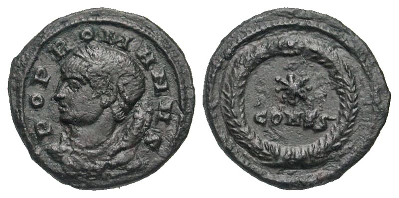 Constantine I. A.D. 307/10-337. AE 4 (14.3 mm, 124 g, 12 h). Constantinople mint, struck ca. A.D. 330. POP ROMANVS, draped bust of Genius Romanii facing left, cornucopia over shoulder / Wreath around, star over CONSS. RIC 22; LRBC 1067. aVF. Rare.