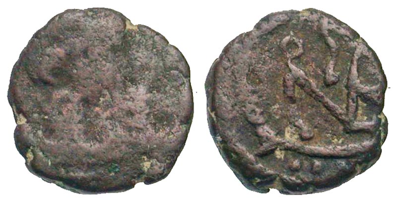 Vandals. Pseudo-Imperial coinage in the name of Zeno. Ca. 474-ca. 491. AE 4 (9.5 mm, 0.57 g, 12 h). Diademed and draped bust right / Monogram of Zeno. BMC 119-122. Fair/VF, clear monogram.