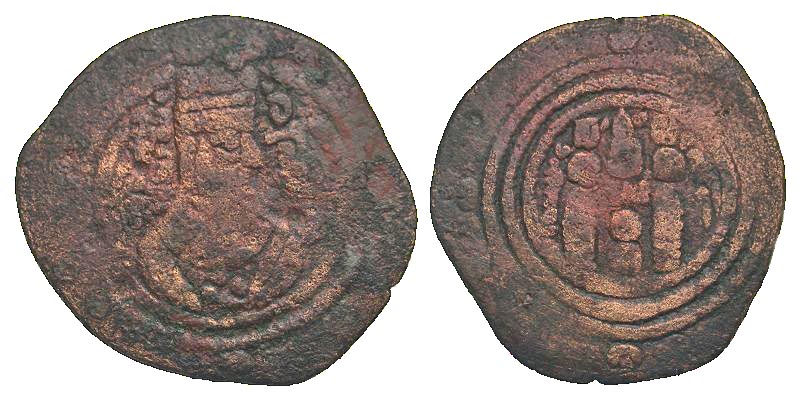 Lot 43-230. Umayyad Caliphate, Arab-Sasanian. temp. Yazid II. 101-105/720-724. AE pashiz. Farrukhzad mint, dated year 104. Very Rare.
