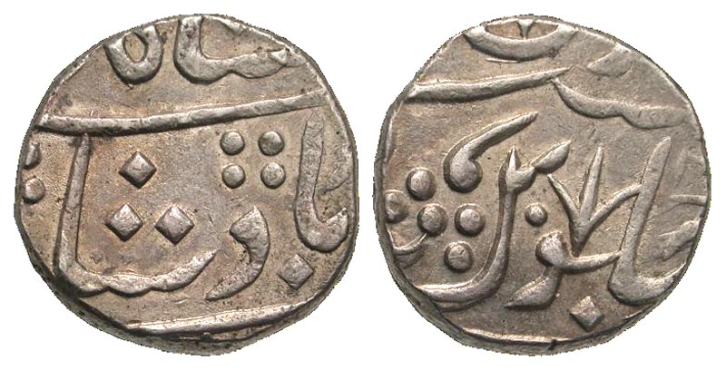 Lot 43-255. Maratha Confederacy. In the name of Shah Alam II. late 1700's. AR rupee. Chandor mint, ND.