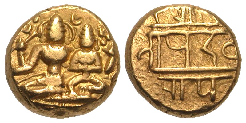 South India, Vijayanagara Empire. Devaraya I or II. 1406-1446. AV pagoda (11.3 mm, 3.41 g, 6 h). Siva and Parvati seated, with antelope head and damaru / Nagari legend. Mitch 450. VF.