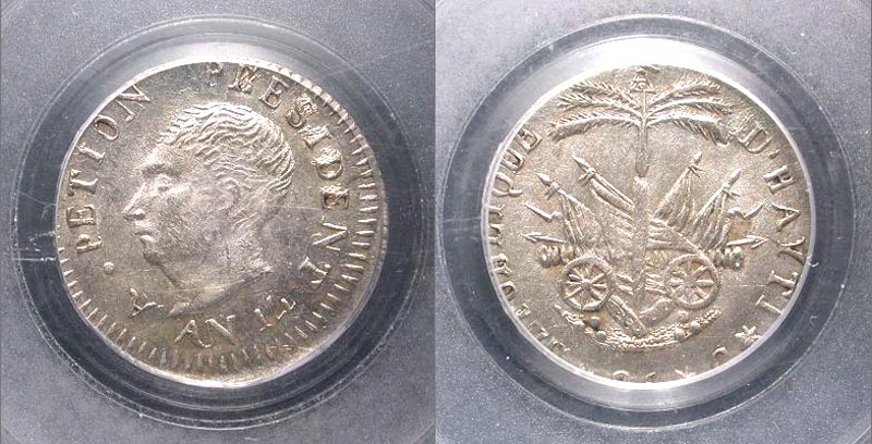 Haiti. AN 14-P (1817). 25 centimes (19 mm). Head of President Petion left / National arms. KM 15.2. PCGS MS62.