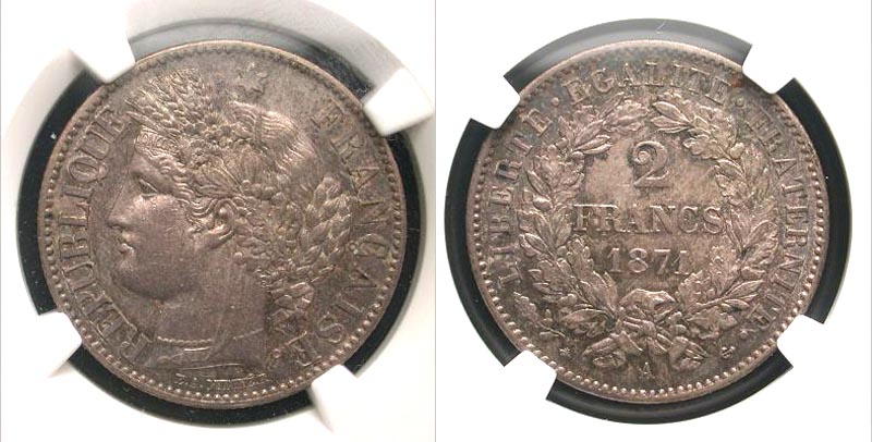 France, Gvt. of National Defense. 1871-A (large A). 2 francs (26 mm, 10.02 g). Gadoury 530; KM 817.1. NGC Unc Details, surface hairlines.