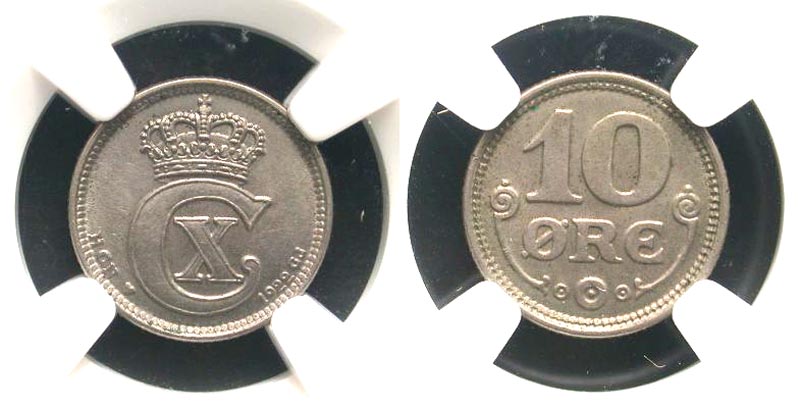 Denmark. Christian X. 1922. 10 ore (15 mm, 1.50 g). KM 818.2a. NGC MS64, scarce this high grade.