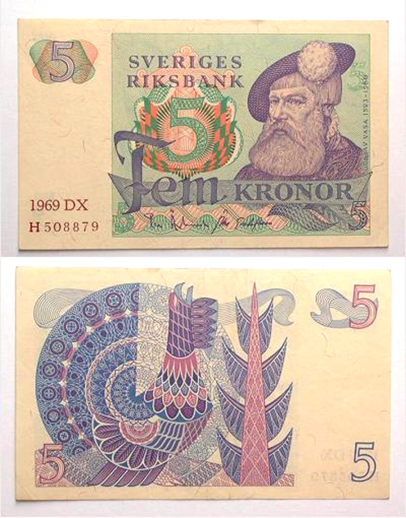 Sweden, 1969, 5 Kronor. Gustav Vasa / Geometric design. Pick 51a. aVF.