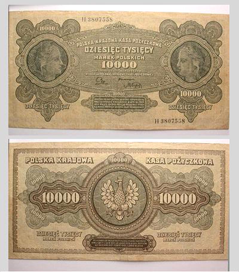 Poland, 1922, 10,000 Marek. Women's heads at left and right / Eagle at center. Pick 32. aVF.