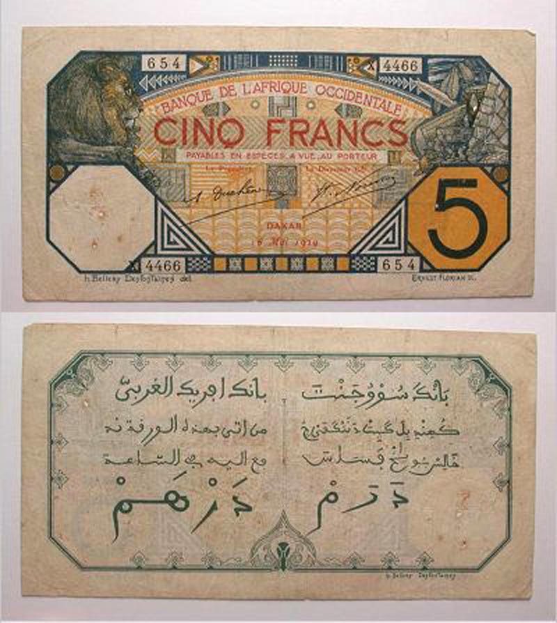 French West Africa, 1929, 5 Francs. Lion to left, bowl and drum to right / Script. Pick 5b. Fine.