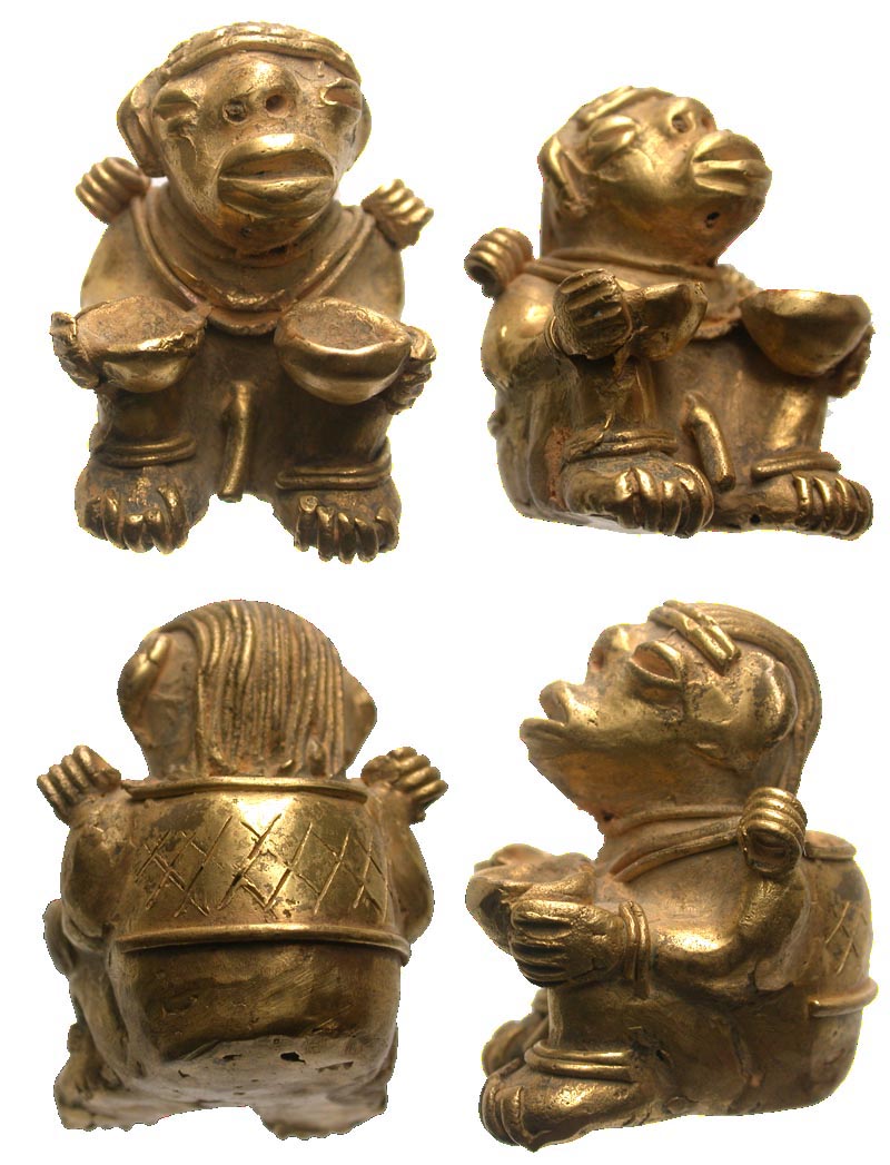 Tairona Shaman Tumbaga Pendant, 1000-1500 AD. A very attractive tumbaga from the Tairona culture in Columbia, ca. 1000-1500 AD. This tumbaga depicts a shaman holding two funeraries. 1 1/2" tall, 27 gms, with intact suspension loops. A very high quality tumbaga. Retail value $750-1500.Tumbagas are made from a naturally occurring alloy of gold and copper, typically around 30% gold and 70% copper. The saurian piece is slightly more red than the other, indicating a higher copper composition. Tumbagas are generally hollow, as are these two examples.