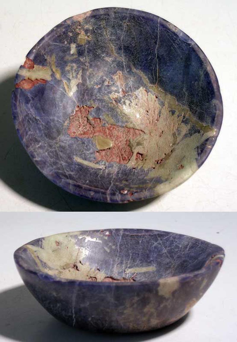 Moche Stone Dish from Peru, ca. 200 - 600 AD. A rare Moche Sodalite dish from Peru, ca. 200 - 600 AD. It is 3-3/8 in diameter and is beautifully polished. What is extremely unusual is that the blue Sodalite formed over a core of different stone, which can be seen in small sections that were not covered during the formation of the stone. Unique. Ex Gallatin estate. Value Range $417 - $550.