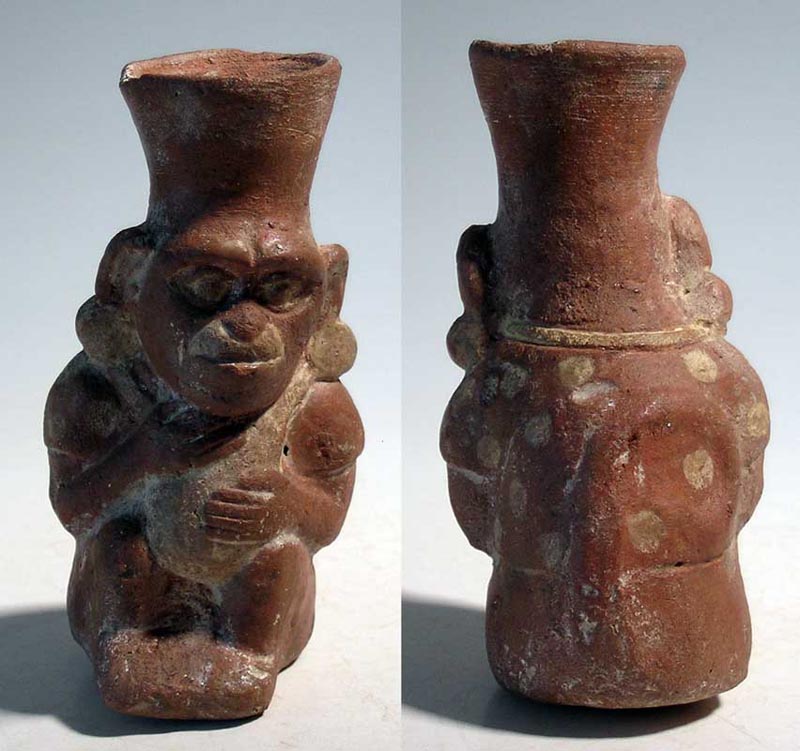 Moche Monkey from Peru, ca. 400 - 700 AD. An adorable Moche Monkey deity from Peru, ca. 400 - 700 AD. This elaborately detailed effigy vessel is 4-1/2 high and depicts a seated monkey, with tail curled up the back, clutching a stuffed bag in his lap. He is wearing a mantle covered with round uncas and is adorned with large ear ornaments. In excellent condition, with good paint and strong mineral deposits. Ex Gallatin estate. Value range: $417 - $600.