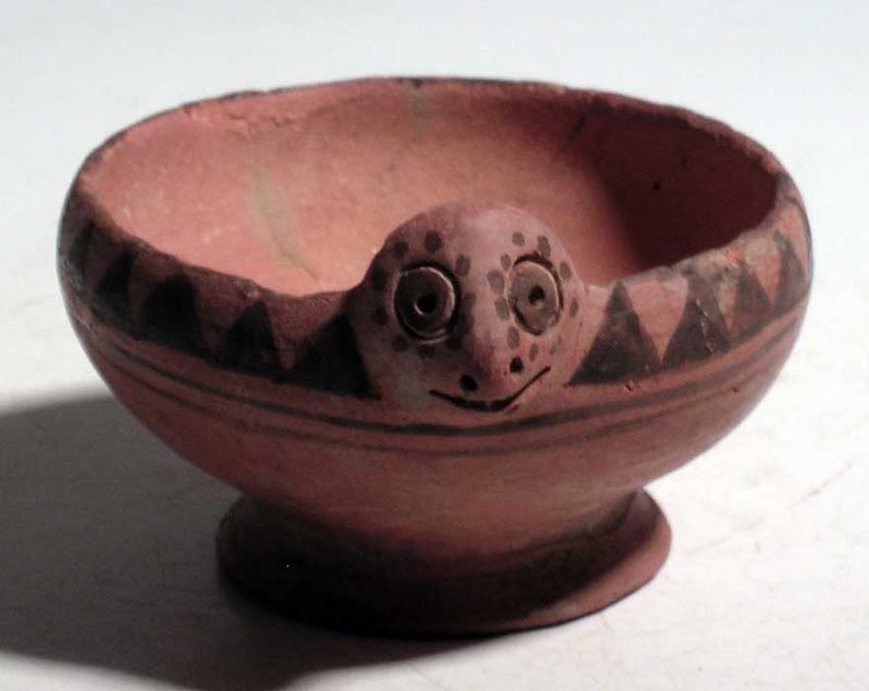 Salinar Bird Dish from Peru, ca. 200 BC - 100 AD. A choice Salinar avian dish from Peru, ca. 200 BC - 100 AD. This footed pinkware example is 2-3/4 in diameter and is adorned with a finely detailed bird head, as well as geometric and linear décor. Good mineral deposits. Ex Gallatin estate. Value Range $208 - $300.