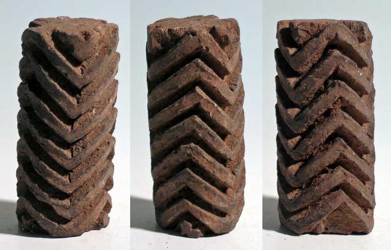 Colima Sello from Mexico, ca. 300 BC - 300 AD. A choice sello (roller seal) from Las Tumas, Colima, West Mexico, ca. 300 BC - 300 AD. This fine, deeply carved, solid cylinder is 2-3/4 long, 1-1/4 in diameter and creates a zigzag chevron design. Early type, with strong mineral deposits. Ex Foxworth estate. Cf. Enciso Design Motifs of Ancient Mexico, page 2. Value range: $208 - $300.