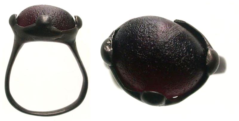 Byzantine Silver Ring with Purple Glass. Sturdy and intact, one prong missing. 4th - 10th centuries A.D. 2.8 cm x 2 cm.