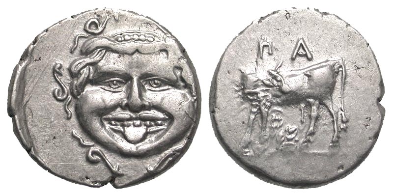Mysia, Parion. 4th century B.C. AR hemidrachm (16.1 mm, 2.42 g, 3 h). Facing gorgoneion / ΠA-PI, bull standing left, head turned right; laurel branch below. BMC 28; SNG France -; SNG von Aulock -. gVF. Scarce variety.
