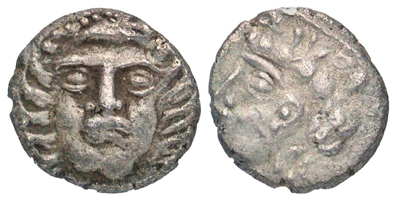 Cilicia, Tarsos. Ca. 389-375 B.C. AR obol (8.7 mm, 0.51 g, 7 h). Female head facing slightly left, wearing earrings / Head of Aphrodite left, wearing ornate stephanos, earring, and necklace. Casabonne Type J2; SNG France 236; SNG Levante -. VF. Rare.