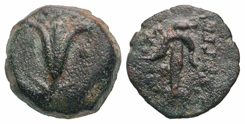 Lot 44-045. Seleukid Kingdom. Antiochos VII Euergetes. 138-129 B.C. AE prutah. Jerusalem mint, Date not clear (either S.E. 181 or 182 (132/1 or 131/0 B.C.).