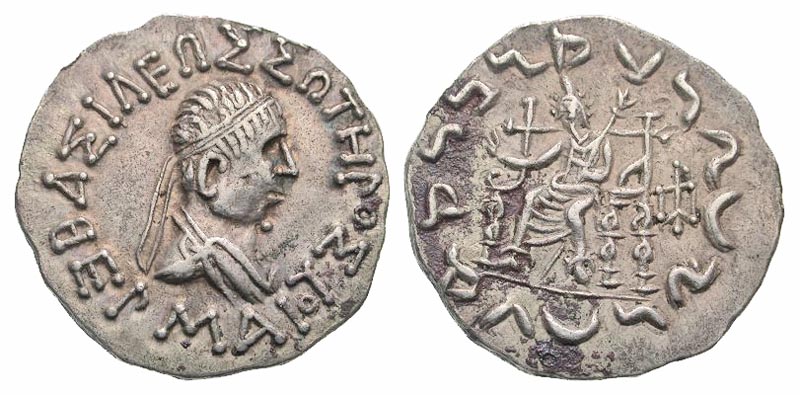 Lot 44-061. Indo-Greek Kingdom. Hermaios. Ca. 90-70 B.C. AR tetradrachm. Posthumous issue.