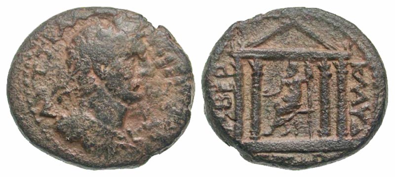 Galilaea, Tiberias. Hadrian. A.D. 117-138. AE 24 (24.4 mm, 10.39 g, 11 h). Dated CY 101 (A.D. 119/20). AYT TPA AΔPIANΩ KAIC CEB, laureate and cuirassed bust right / TIBEP KΛAYΔ, Zeus seated left on throne and within tetrastyle temple, holding patera and scepter; ET AP below. Rosenberger 12; BMC 23; SNG ANS 1109-11; Sofaer 10. F/VF, sandy highlights. Ex Amphora Coins.
