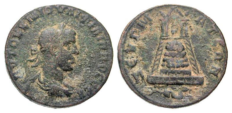 Syria, Commagene. Zeugma. Philip II. A.D. 247-249. AE 29 (29.0 mm, 19.96 g, 12 h). AVTO K K M IOVLI ΦIΛIΠΠOC CEB, laureate, draped and cuirassed bust right / ZEVΓMATEΩN, tetrastyle temple with peribolos containing grove of trees; capricorn right below. McAlee p. 328, E; Butcher 31c; SNG Cop 35. F/VF, black patina with earthen deposits.