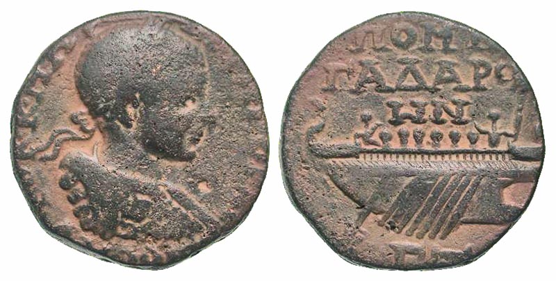Syria, Decapolis. Gadara. Gordian III. A.D. 238-244. AE 25 (27.2 mm, 13.83 g, 1 h). Dated CY 303 ( A.D. 239/40). AVTOK K · MAP ANTω ΓOPΔIANIOC, laureate, draped and cuirassed bust right / ΠOMΠ / ΓAΔAPЄ / ωN, ΓT in exergue, galley left with captain, seven oarsmen, and steersman on deck. SNG ANS 1332; Spijkerman 93; Rosenberger 90; Sofaer 102. F/VF, red highlights. Scarce.