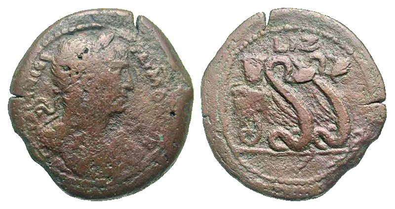 Egypt, Alexandria. Trajan. A.D. 98-117. AE drachm (36.5 mm, 16.08 g, 1 h). Dated year 17=A.D. 113/14. AVT TPAIAN CEB ΓEPM ΔAKIK, laureate head right / LIZ, modius set upon a biga, drawn by winged serpents. Dattari 1103; Milne 708; Emmett 538. near Fine, pitted.