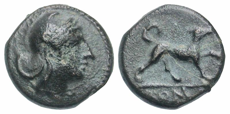 Anonymous. 234-231 B.C. AE half litra (11.8 mm, 1.56 g, 7 h). Rome mint. Head of Roma right, wearing Phrygian helmet / ROMA, dog standing right, raising forepaw. Crawford 26/4; Sydenham 22; HN Italy 309. VF, black patina. Rare.