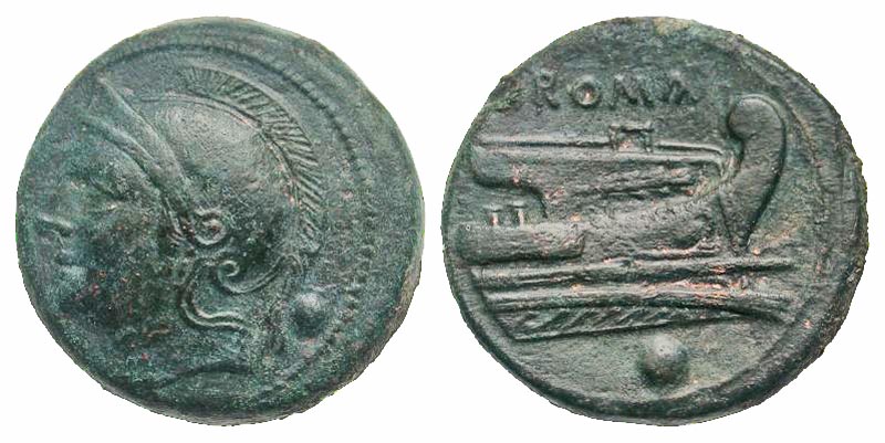 Anonymous. Ca. 217-215 B.C. AE uncia (24.7 mm, 12.62 g, 4 h). Semi-Libral standard. Rome mint. Helmeted head of Roma left; pellet behind / ROMA, prow of galley right; pellet below. Crawford 38/6; Sydenham 86. VF.