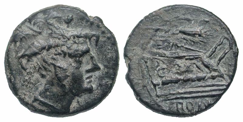 Anonymous. 211-210 B.C. AE sextans (20.0 mm, 6.32 g, 2 h). Sicilian mint. Head of Mercury right wearing winged petasos; two pellets above / ROMA, prow of galley right; grain ear above. Crawford 72/8; Sydenham 195d. VF, black patina. Ex RBW collection (not in previous sales), Ex Goodman collection.