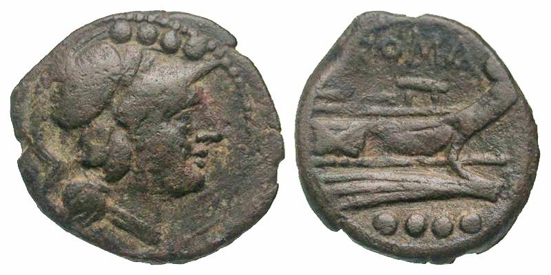 Anonymous. after 211 B.C. AE triens (23.2 mm, 4.38 g, 3 h). Rome mint. Helmeted head of Mercury right, four pellets above / ROMA, prow of galley right; four pellets below. Crawford 56/4; Sydenham 143b. aVF.