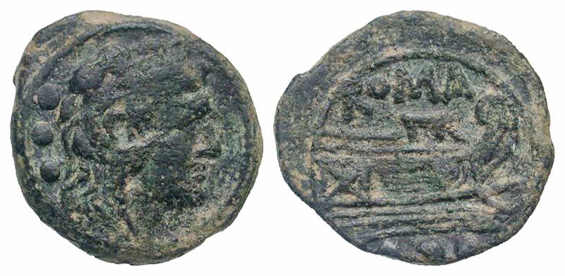 Anonymous. after 211 B.C. AE quadrans (19.8 mm, 3.86 g, 4 h). Uncertain mint. Head of Hercules right, wearing lion's-skin headdress; three pellets behind / ROMA, prow of galley right; three pellets below. Crawford 56/5; Sydenham 143c. VF, black patina.
