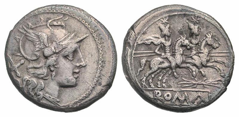 Anonymous [Thunderbolt]. Ca. 206-195 B.C. AR denarius (18.8 mm, 3.78 g, 11 h). Rome mint. Helmeted head of Roma right, X behind / ROMA, the Dioscuri on horseback riding right, each holding spear; star above each; thunderbolt below. Crawford 119/2; Sydenham 246; RSC 20hh. Toned aVF. Very Rare.