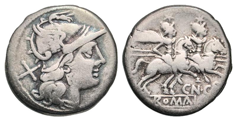 Cn. Calpurnius Piso. Ca. 189-180 B.C. AR denarius (18.7 mm, 3.89 g, 10 h). Rome mint. Helmeted head of Roma right; X behind / CN·CALP monogram / ROMA, the Dioscuri on horseback riding right, each holding spear; star above each. Crawford 153/1; Sydenham 348; RSC Calpurnia 1. aVF.