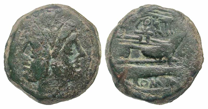 Anonymous. 169-158 B.C. AE as (31.7 mm, 29.72 g, 11 h). Uncial standard. Rome mint. Laureate head of Janus; above, I / ROMA in exergue, prow of galley right; above, she-wolf standing right, head left, suckling the twins Romulus and Remus, I to right. Crawford 183/1; Sydenham 297. Fine. Scarce.