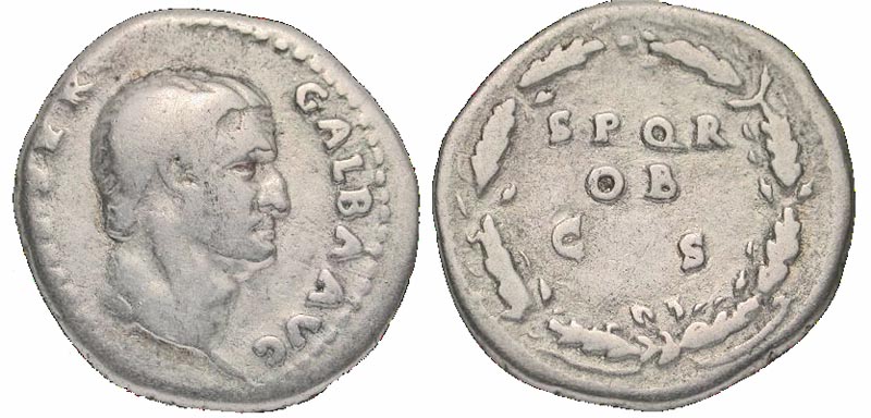 Galba. A.D. 68-69. AR denarius (18.6 mm, 3.18 g, 5 h). Rome mint. IMP SER GALBA AVG, bare head right / S P Q R/ OB/ C S, legend in three lines within oak wreath. RIC 167; BMCRE 34; RSC 287. gFine. Scarce.