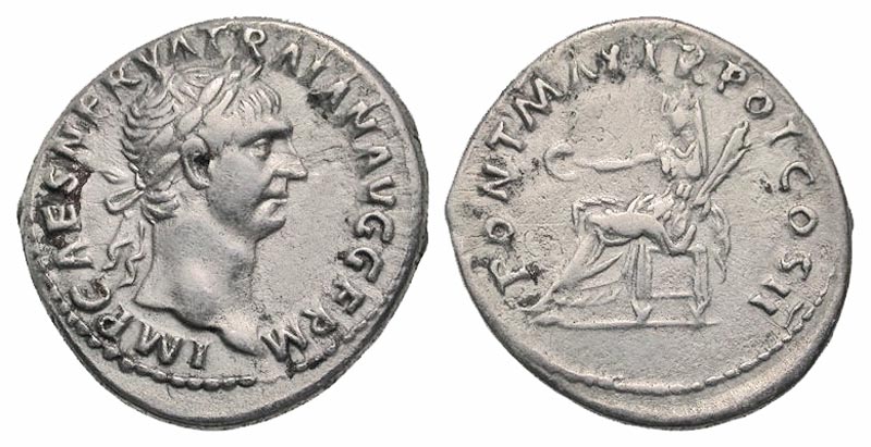 Lot 44-146. Trajan. A.D. 98-117. AR denarius. Rome mint, struck A.D. 98. Ex Elwood Rafn collection.