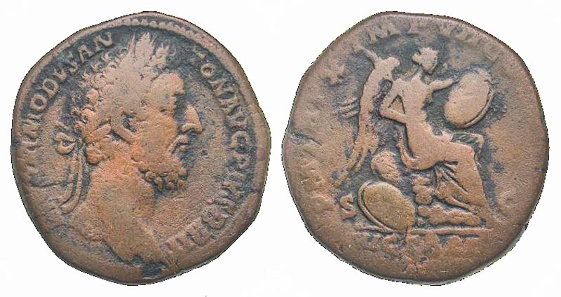 Lot 44-159. Commodus. A.D. 177-192. AE sestertius. Rome mint, struck A.D. 184-185. British victory issue.