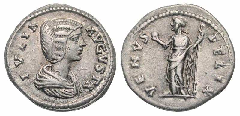 Lot 44-166. Julia Domna. Augusta, A.D. 193-217. AR denarius. Laodicea ad Mare mint, struck A.D. 198-202. Scarce. Ex Elwood Rafn collection.