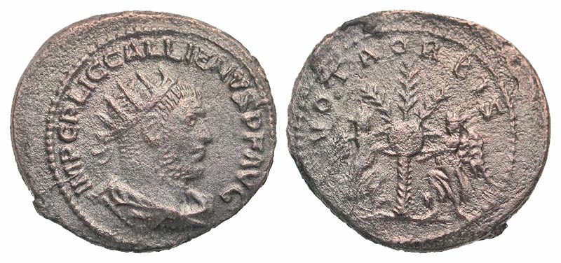 Gallienus. A.D. 253-268. BI antoninianus (24.4 mm, 5.50 g, 11 h). Samosata mint, struck A.D. 259. IMP C P LIC GALLIENVS P F AVG , radiate, draped, and cuirassed bust right / VOTA ORBIS, two Victories standing facing one another, hanging shield inscribed S C on palm tree . Göbl 1682m; RIC 459; RSC 1335b. Fine, high silver content.