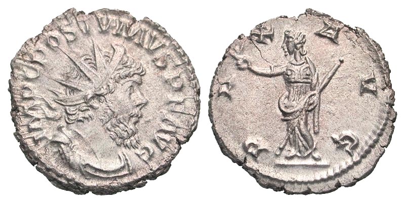 Postumus. Romano-Gallic Emperor, A.D. 260-269. BI antoninianus (20 mm, 3.35 g, 1 h). Treveri mint, struck A.D. 268. IMP C POSTVMVS P F AVG, radiate, draped, and cuirassed bust right / PAX AVG, Pax standing left, holding branch and scepter. RIC 318; AGK 52a; RSC 215a. Good VF, light porosity.
