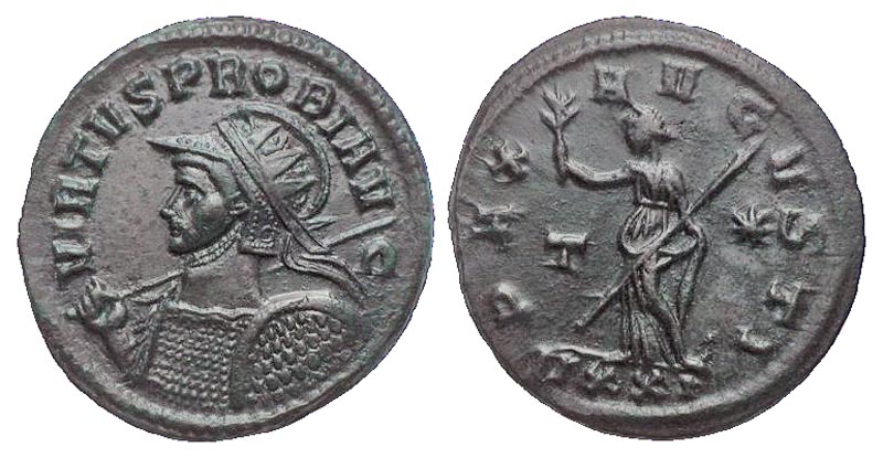 Probus. A.D. 276-282. AE antoninianus (23.3 mm, 3.87 g, 7 h). Ticinum mint, struck A.D. 281. VIRTVS PROBI AVG, radiate, helmeted and cuirassed bust left, holding spear over far shoulder and shield / PAX AVGVSTI, Pax standing left, holding branch and scepter; T-*/IIXXI in exergue. RIC 517. gVF, black patina.