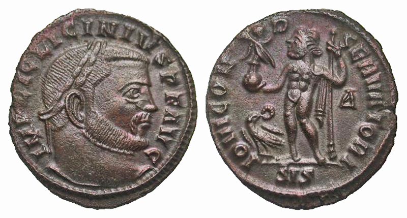 Licinius I. A.D. 308-324. AE follis (21.9 mm, 3.25 g, 11 h). Siscia mint, struck A.D. 313-315. IMP C LIC LICINIVS P F AVG, laureate head right / IOVI CONSERVATORI, Jupiter standing facing, head left, chlamys draped from shoulder, holding Nike and scepter, eagle with wreath at his feet; Δ in field, SIS in exergue. RIC 8. VF.
