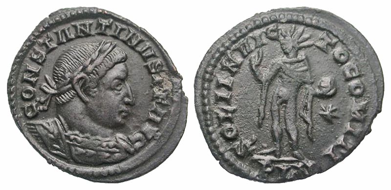 Constantine I. A.D. 307/10-337. AE follis (24.3 mm, 3.11 g, 4 h). London mint, struck A.D. 310-312. CONSTANTINVS PF AVG, laureate and cuirassed bust right / SOLI INVICTO COMITI, Sol standing left, chlamys across left shoulder, holding globe, right hand raised; star in right field, PLN in exergue. RIC 234. VF.