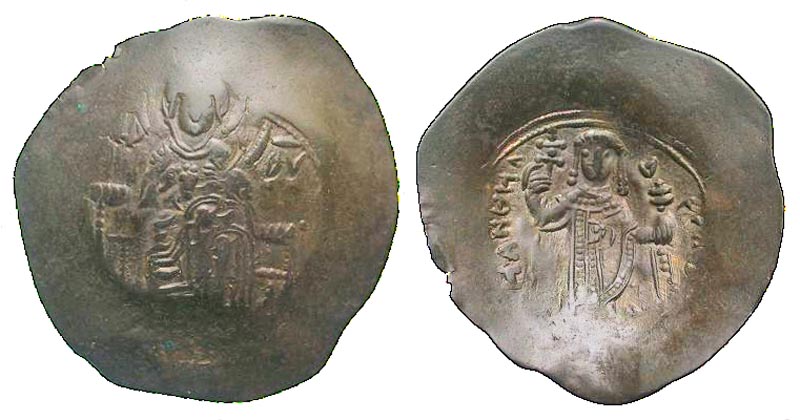 Manuel I Comnenus. 1143-1180. BI trachy (32.4 mm, 3.62 g, 6 h). Constantinople mint. MP-ΘV, the Virgin Mary, enthroned facing, nimbate and wearing pallium and maphorium.She holds nimbate head of infant Christ before her / MANOVHΛ ΔECΠOTHC, Manuel standing facing, wearing crown, chlamys and divitision, holding labarum and patriarchal cross on globe. SBV 1964; DOC 12. gVF, sharp details.