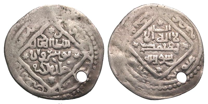 Ilkhans (Mongols of Persia), 3rd Period: Rival Khans. Anushiravan. 747-757/1344-1356. AR 2 dirhams (19.1 mm, 1.30 g, 3 h). Type C. Uncertain Mint, 747 A.H.. Album 2263. VF, holed.