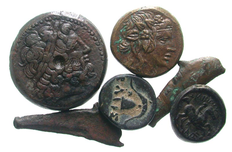 [Greek]. Lot of 6 Greek Bronze Coins. Macedon, Philip II / Macedon, Demetrious Poliorketes / Pontos, Amisos / Ptolemy II / (2) Olbian dolphins. Ex Elwood Rafn collection.