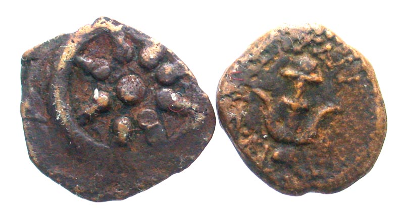[Judaea]. Lot of 2 Biblical Widow's Mites. Alexander Jannaeus,AE prutah. Star and anchor. Fine. This type is typically referred to as Widow's Mites. Ex Elwood Rafn collection.