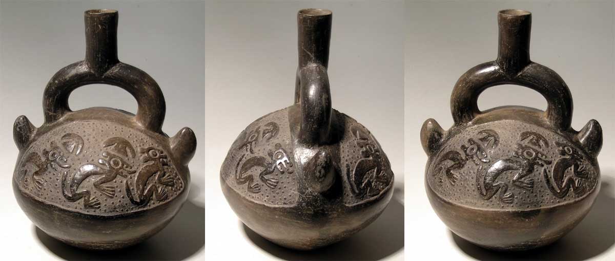 Chimu Bottle from Peru, ca. 1100 - 1450 AD. An unusually large Chimu bottle from Peru, ca. 1100 - 1450 AD. It is 9-1/2" high, 7-1/2" wide and depicts a trio of playful foxes on each side. In each group a pair is portrayed with tumi ornaments above their heads, in apparent pursuit of the lead animal. Large adornos protrude at the base of the stirrup spout. In excellent condition, with strong mineral deposits. Ex Pachenko collection. Value range: $500 - $700.