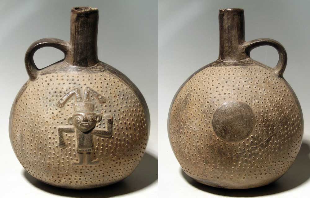 Chimu Shaman Bottle from Peru, ca. 1100 - 1450 AD. A large Chimu shaman bottle from Peru, ca. 1100 - 1450 AD. This crisply molded vessel is 10-1/4" high and features a shaman holding an object in a raised hand. He is wearing a fancy headdress and a tunic with ornamental fringe. The back side is decorated with a simple solar motif. That side also shows an interesting manufacturing flaw that was caused by a break/crack in the mold used to make this vessel. In excellent condition, with good mineral deposits. Ex Pachenko collection. Value range: $500 - $600.